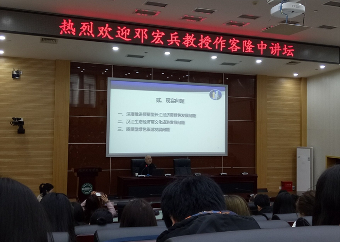 邓宏兵教授首先祝贺伟德国际1946bv成立六十周年以及bevictor伟德国际1946的成立,接着进行以“生态优先,绿色发展”为主题的专题讲座,探讨在资源环境的制约下长江经济带如何发展。邓宏兵教授的报告分三部分即现实问题,质量问题,以及给师生的建议。具体提出生态安全战略是前提和关键所在,大保护不等于不开发,而是要找到合适的方法、途径,从而进行循环、低碳发展;以长江经济带经济发展质量测量与评估为例,指出发展质量是核心工作;提出“神山•圣水•汉源”为主线介绍汉江生态经济带文化旅游发展问题。之后,邓教授提出:我们专业要打造“双一流”,在今后的发展中以与北大,国外地理旅游专业对接;我们老师要多做国家项目,多发高质量论文;我们同学要以考研,考博为目标的期望。