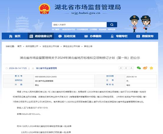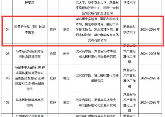 (资环通讯员 龙雨萍) 近日,湖北省市场监督管理局发布的《关于2024年湖北省地方标准拟立项制修订计划(第一批)的公示》文件中,由我校资环学院龙雨萍副教授执笔起草的《科普研学基(营)地基本要求》成功通过评审,被列入湖北省地方标准立项计划。