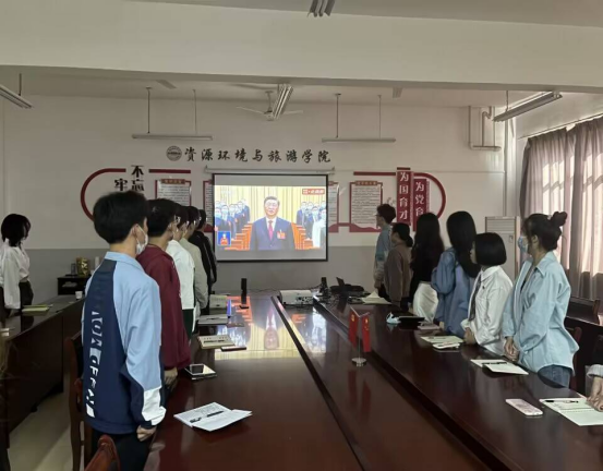 上午十点,大会准时召开,由国务院总理李克强主持开幕,参与观看直播的同学与大会同步,全体起立奏唱国歌、默哀致敬。紧接着聆听习近平同志代表中共中央十九届委员会所作的主题为“高举中国特色社会主义伟大旗帜,全面贯彻习近平新时代中国特色社会主义思想,弘扬伟大建党精神,自信自强、守正创新,踔厉奋发、勇毅前行,为全面建设社会主义现代化国家、全面推进中华民族伟大复兴而团结奋斗“的工作报告。