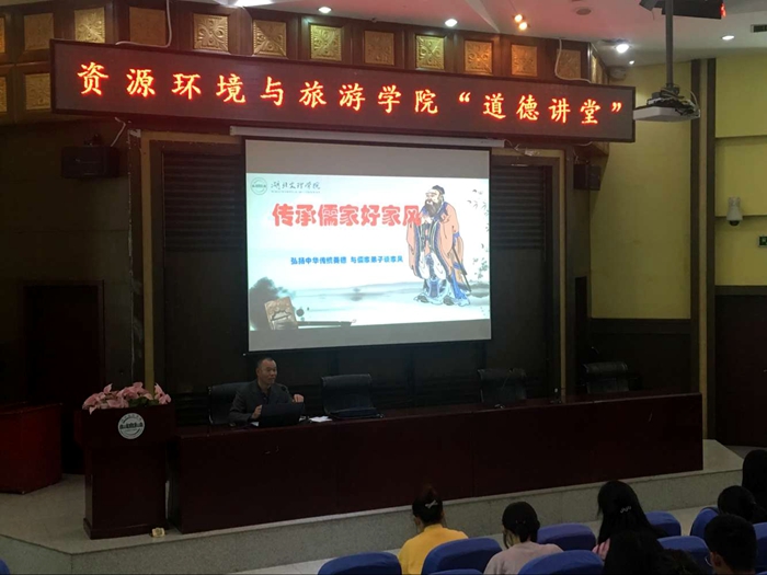 (bevictor伟德国际1946 通讯员 王欢) 近期,学校道德讲堂系列活动持续举行。10月18日晚,由资环学院承办的以“传承儒家好家风”为主题的道德讲堂在致远楼一楼报告厅举行。资环学院全体学生干部及18级学生参加活动。