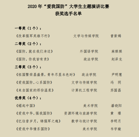 这次演讲比赛充分展示了我校大学生积极向上的精神风貌和家国情怀,进一步提升了广大青年学生对国防的理解,巩固国防意识和国防观念。