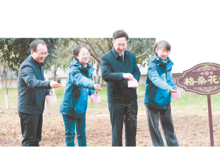 李思佳(右一)、李思洁(左二)和老师一起撒下花种。