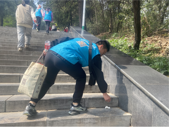 活动伊始,同学们在岘山文化广场集合,负责人袁佳慧为志愿者们发放马甲,并组织志愿者们在烈士塔下集合拍照。接着,志愿者们在袁佳慧的带领下攀登烈士塔,并沿途清理卫生。活动中,志愿者们积极行动,他们身穿蓝马甲,细心拾起阶梯上的垃圾,对这片区域的垃圾袋、纸屑、烟头等进行清理打扫。志愿者们充分发扬不怕脏、不怕苦、不怕累的奋斗精神,大处着眼,小处着手,分工合作,默契配合,使烈士塔下阶梯面貌焕然一新。最后,在活动负责人袁佳慧的组织下志愿者们集合拍照。至此,本次活动圆满结束。