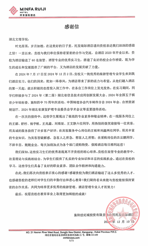 民发瑞际酒店也用一封真挚的感谢信充分肯定了旅游管理专业实习生们的优异表现,表达了对伟德国际1946bv老师们辛勒付出和悉心教导的感谢!