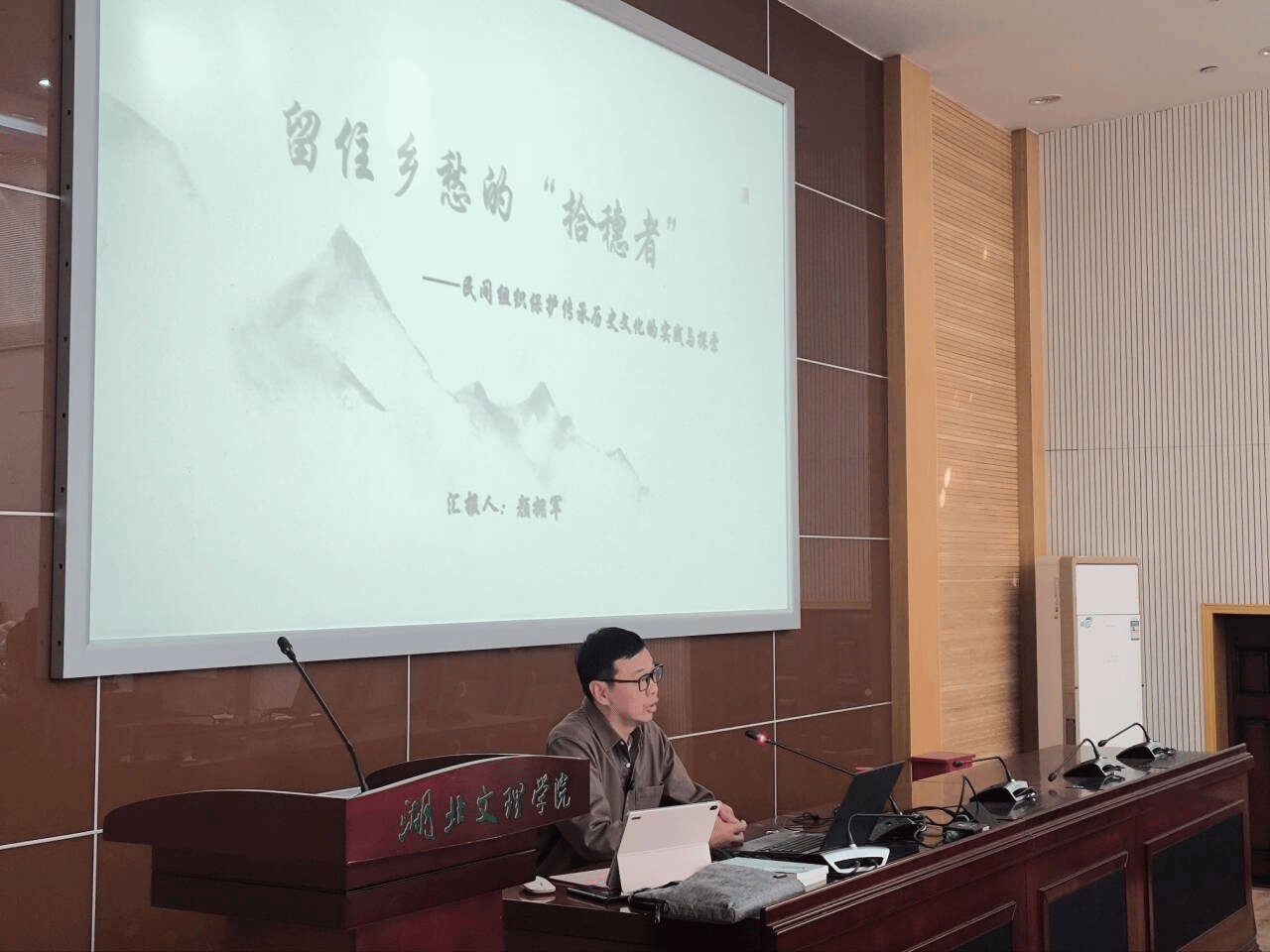 活动开始时,颜拥军以法国画家米勒名画《拾穗者》为引,阐释了团队名称的由来与文化内涵,结合自身从医经历与投身文化保护的转变,生动讲述了“拾穗者”团队二十年来深入襄阳街巷村落、探寻古山寨遗址、抢救老河口木版年画、记录樊城老街风貌的艰辛历程。他通过《樊城码头文化》《口述襄阳》等地方文化编纂成果的展示,系统介绍了团队在挖掘、整理和传播汉水文化方面取得的突出成绩,并强调“力所能及地做实事”“在田野中寻找真知”是团队始终秉持的核心理念。在交流分享环节,参会师生踊跃发言。有学生分享道:“颜老师的故事让我深刻体会到,文化保护不仅是专家的责任,更是每一位青年对故乡应有的情感担当。‘慎独’与‘慎终如始’的坚持,在文化传承中显得尤为珍贵。”也有教师感慨:“颜老师二十年如一日的坚守,正是传统文化中‘守正创新’精神的当代体现,为我们践行育人使命提供了生动榜样。”分享结束后,全体参会师生以热烈的掌声向颜拥军致以崇高敬意,现场氛围庄重而热烈。
