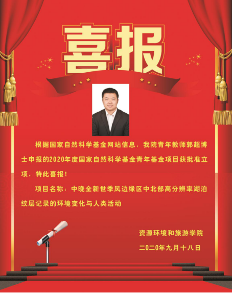9月18日,根据国家自然科学基金网站信息,我院青年教师郭超博士申报的2020年度国家自然科学基金青年基金项目(项目名称:中晚全新世季风边缘区中北部高分辨率湖泊纹层记录的环境变化与人类活动)获批准立项,特此恭贺!