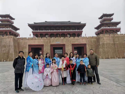 位于枣阳市的中国汉城景区,是以影视拍摄服务为主,兼具娱乐休闲、旅游观光等功能的综合性旅游区,2018年,中国汉城被湖北省教育厅授予“中国汉文化研学旅行基地”。在这里,资环学院的女教师们穿着汉服,感悟汉史,朱运海博士给大家讲解了我国服饰制度的演变及其深远的文化内涵,老师们还对汉城景区研学活动的宣传、运营等情况进行了调研。